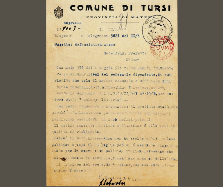 Anche a Tursi, il solo caso è quello del medico comunale, in possesso di sciarpa littorio. Ma il Sindaco sottolinea l’impossibilità di sospenderlo, poiché non ci sono altri medici in paese e l’unico sostituto è al fronte. Si sottolinea inoltre come il medico non abbia “svolto attiva azione politica” e si si sia dichiarato vicino ai nuovi valori democratici.