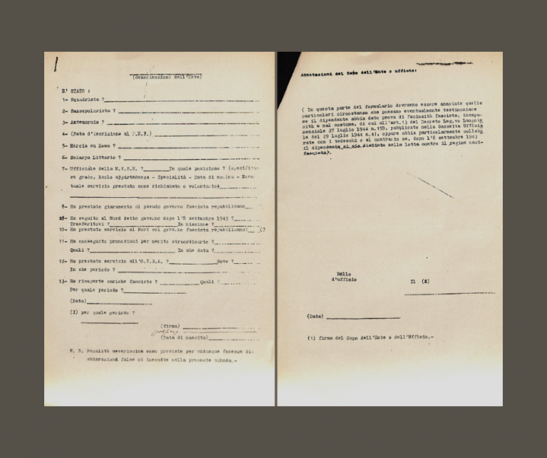 Il cuore dell’epurazione amministrativa fu un formulario dettagliato, da compilare per ogni dipendente. Esso includeva domande su: