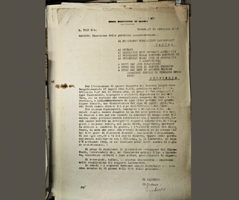 Attraverso documenti tratti dal Fondo Prefettura, scopriamo come, tra vincoli normativi e condizioni locali, l’apparato burocratico italiano tentò di rimuovere gli ingranaggi compromessi dal regime fascista. Una storia fatta di moduli, decisioni amministrative, ma anche di valutazioni soggettive e compromessi pratici.