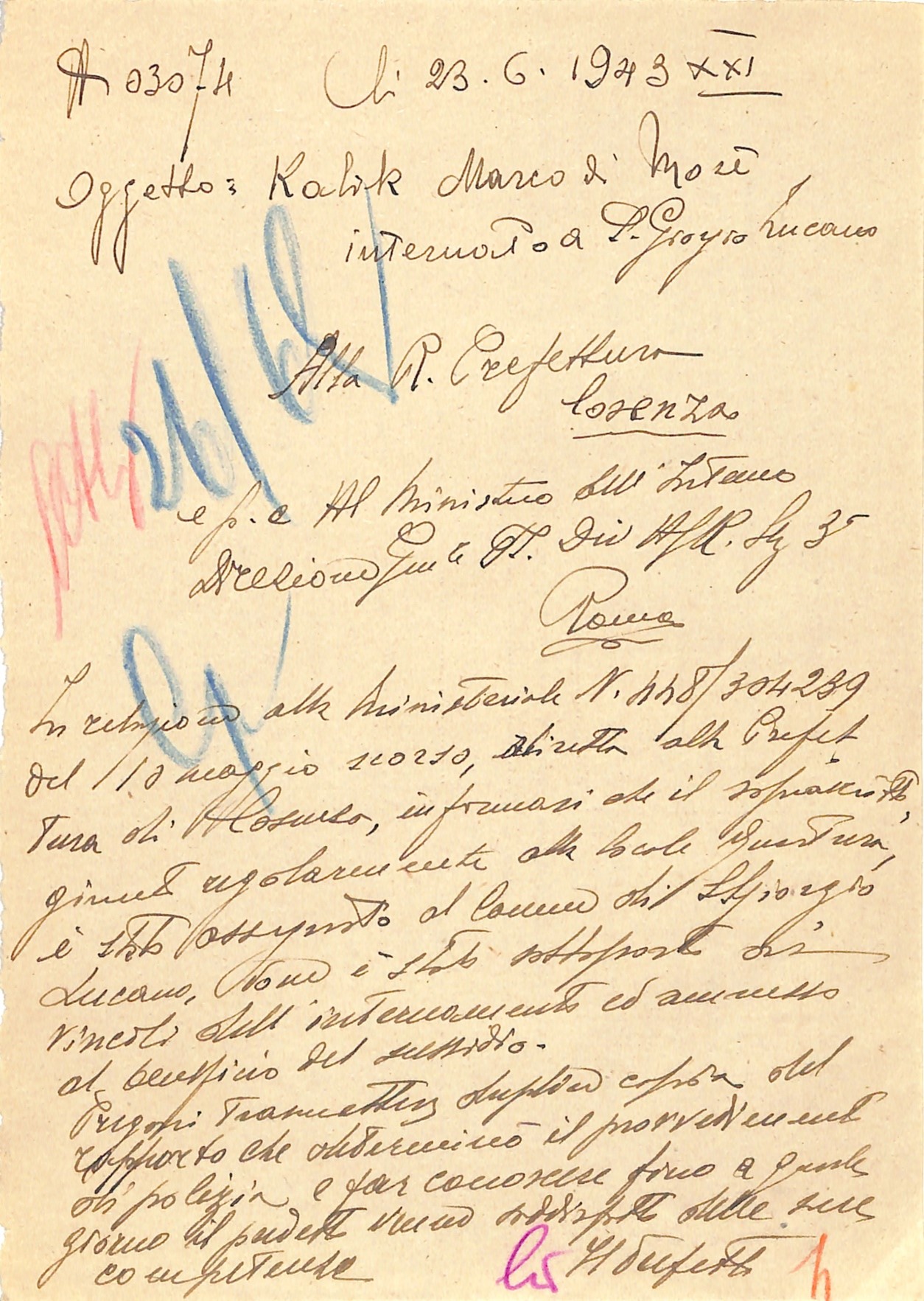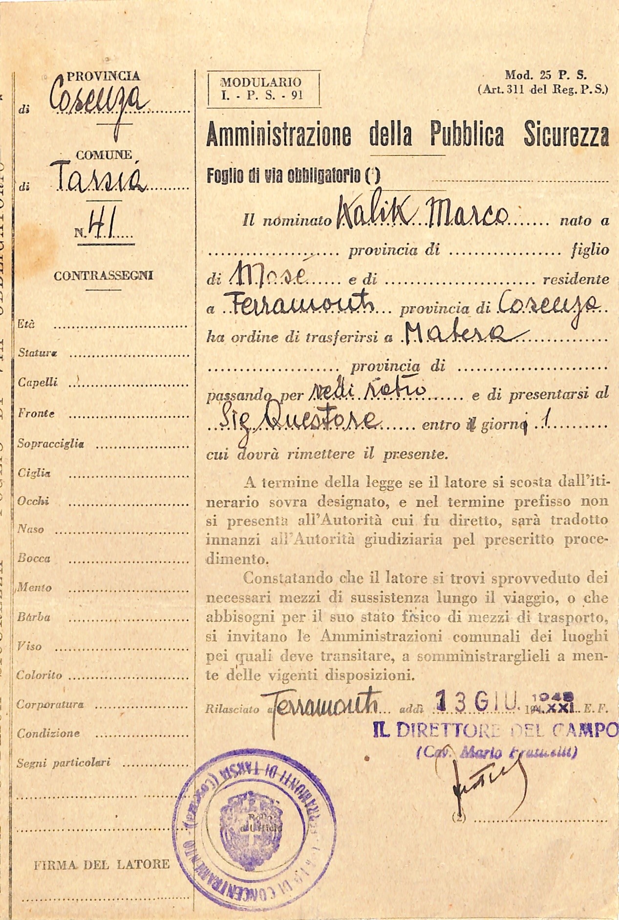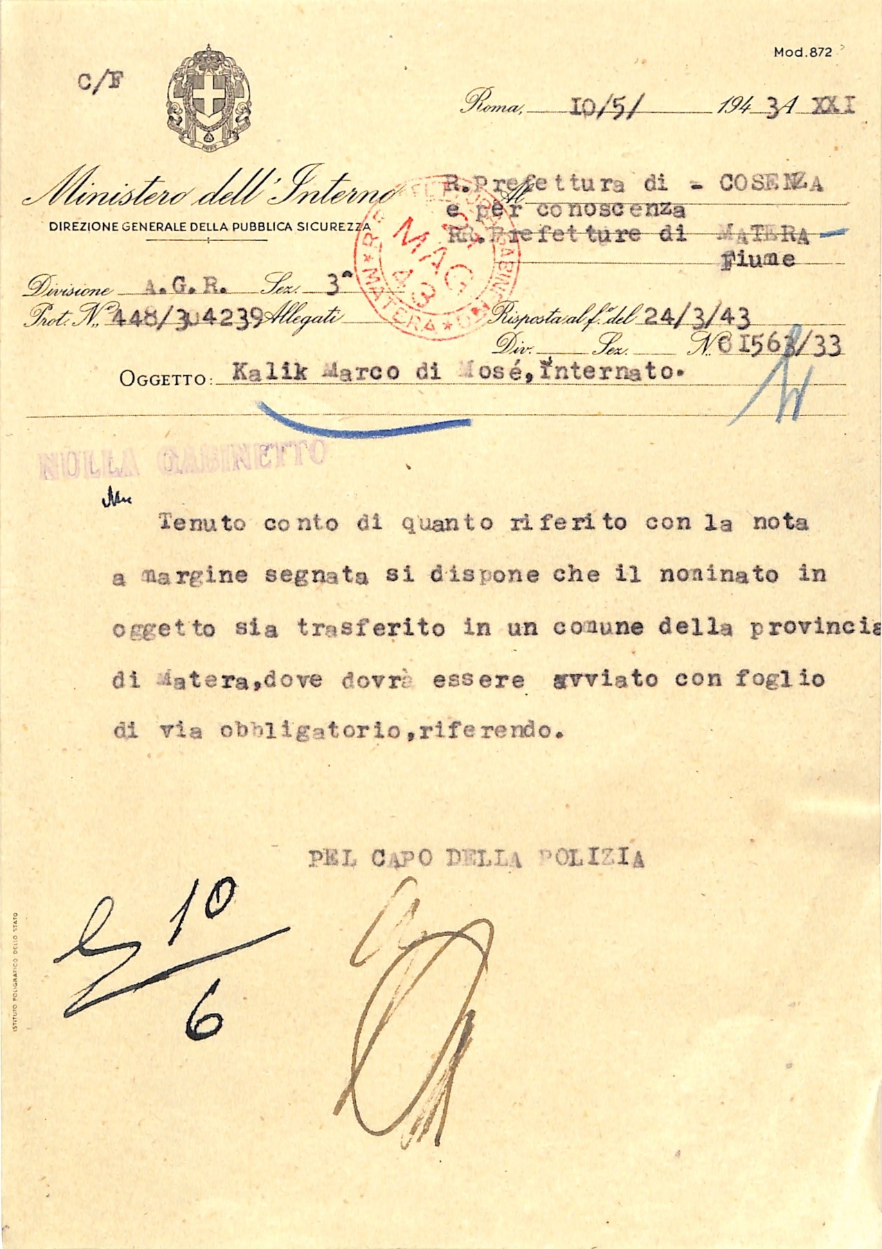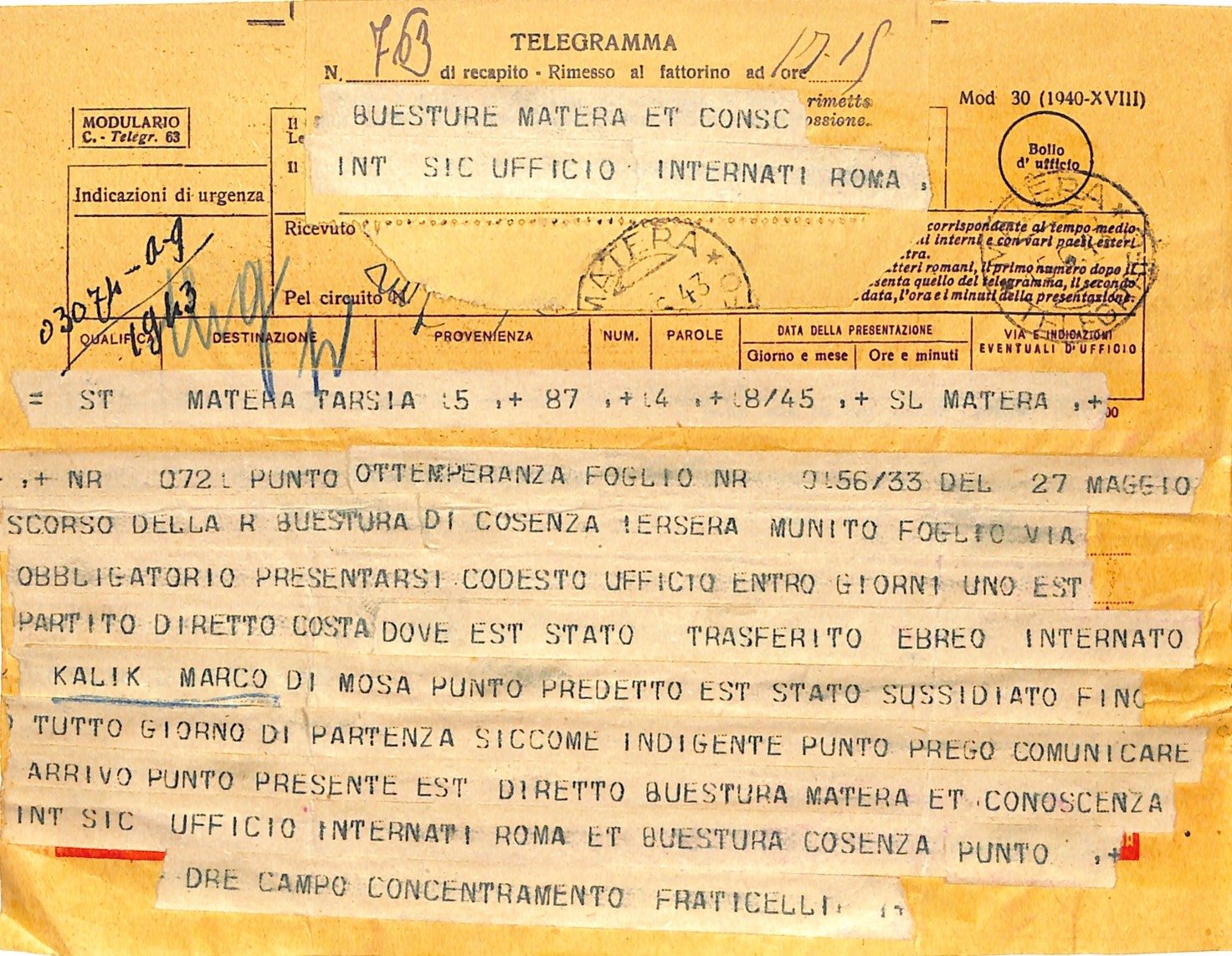 Tra gli internati vi fu Mark Kalik, nato a Fiume nel 1910, cittadino italiano dal 1933. Dopo vari trasferimenti, fu inviato a Ferramonti e successivamente destinato al confino in Basilicata. Il suo fascicolo personale e il passaporto sono conservati nel fondo Questura dell’Archivio di Stato di Matera.