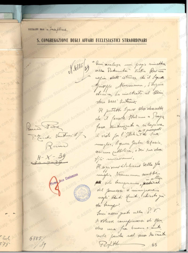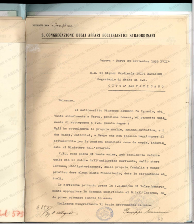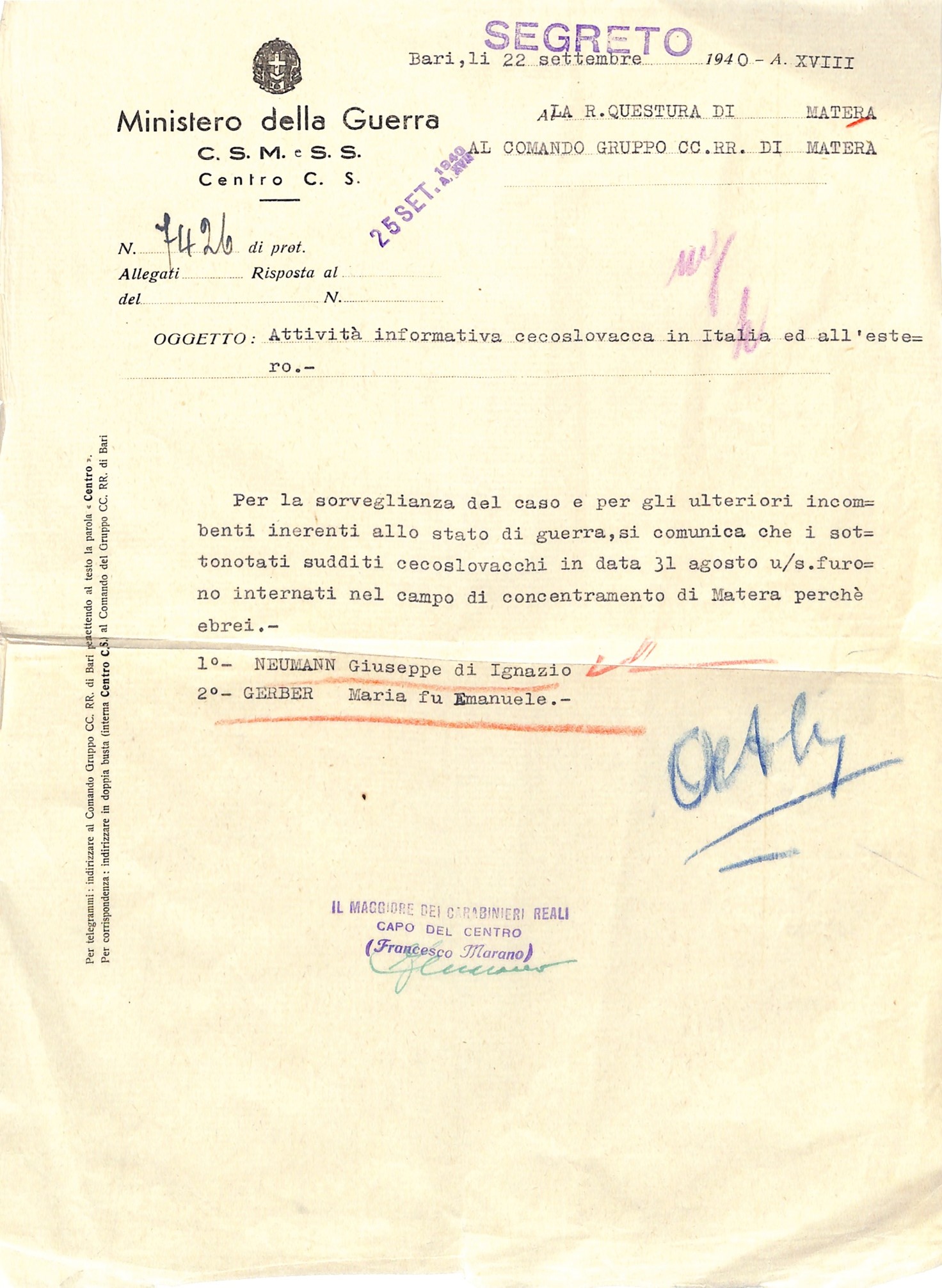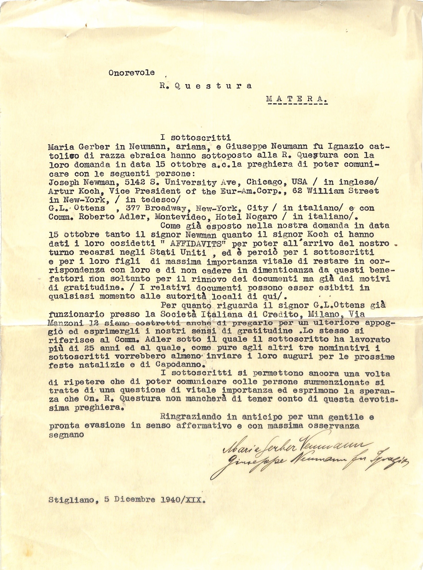 Molti ebrei cecoslovacchi, fuggiti dalle persecuzioni naziste, trovarono rifugio temporaneo in Italia. Tra questi vi fu la famiglia di Giuseppe Neumann, professore e direttore di banca, internato a Stigliano insieme alla moglie Maria Gerber e ai figli Giovanni e Gertrude.