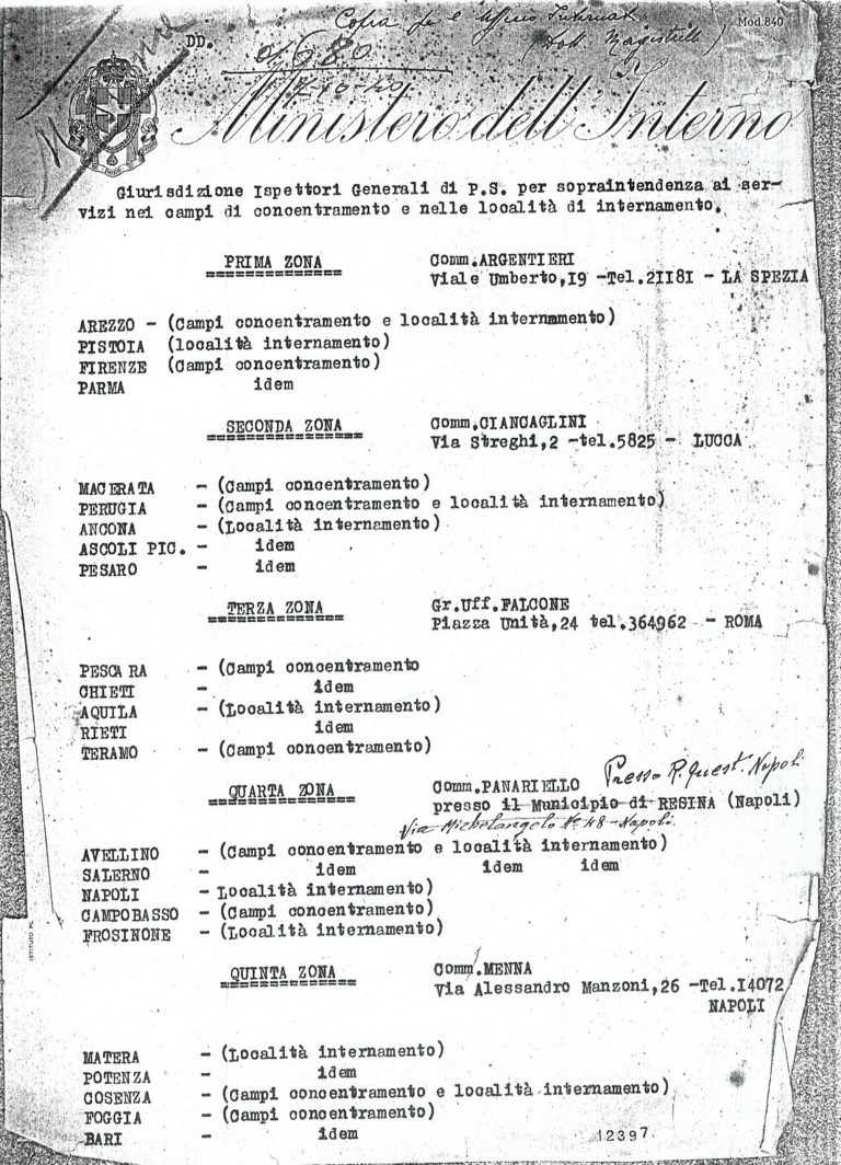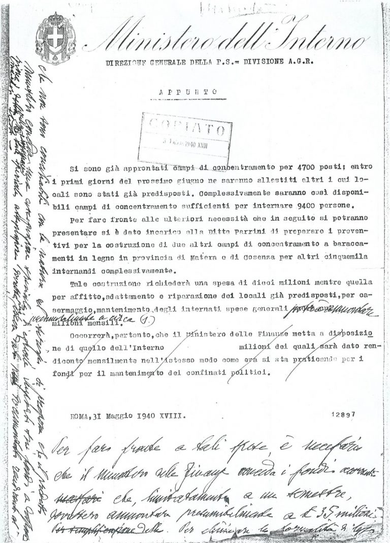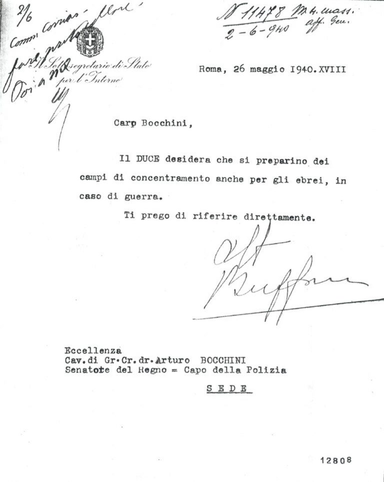Con l’approssimarsi dell’ingresso dell’Italia in guerra, il 26 maggio 1940 il sottosegretario Guido Buffarini Guidi comunicò al Capo della Polizia Arturo Bocchini la volontà di predisporre campi di concentramento anche per gli ebrei.