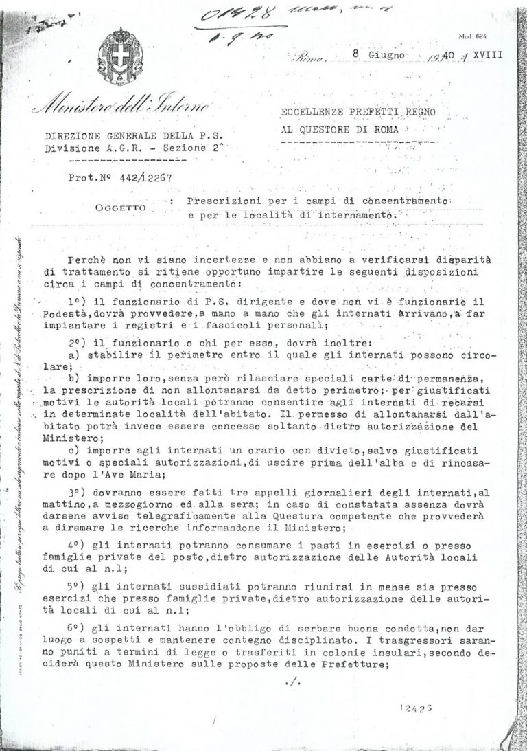 Nel giugno del 1940 vennero emanate le prescrizioni per i campi di concentramento e le località di internamento, individuate in gran parte nel Sud Italia. Nel settembre dello stesso anno furono istituiti ufficialmente i primi 43 campi di internamento.