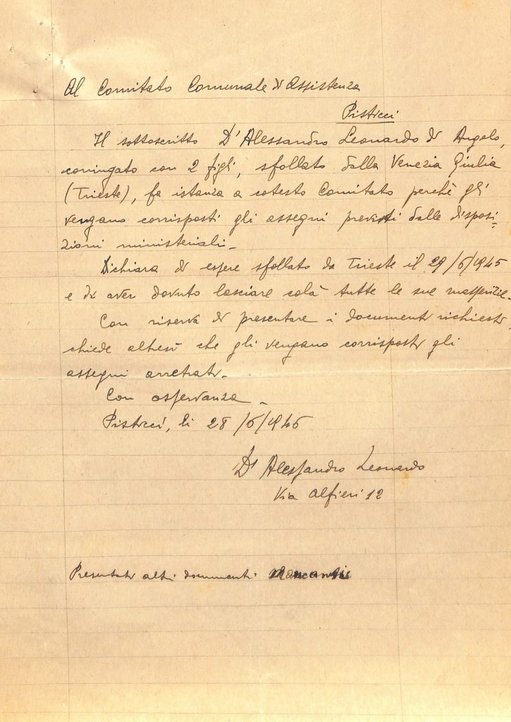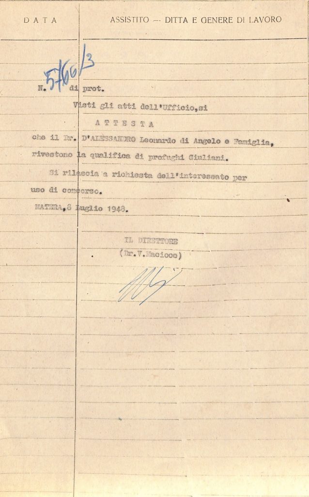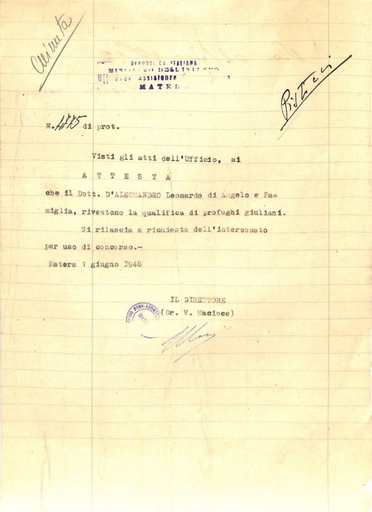D’Alessandro e la sua famiglia trovarono asilo a Pisticci, località che ospitò una consistente colonia di profughi giuliano-dalmati. La documentazione consente di ricostruire le modalità di assistenza, le richieste di sussidio e il riconoscimento ufficiale dello status di profugo.
